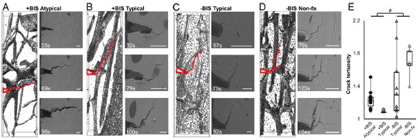 Next, we extended our prior work to identify spectroscopic and biochemical markers of bone quality in an expanded cohort of patients with AFFs. We demonstrated that women with AFFs had harder, more mineralized cortical bone than those with typical fragility fractures who also used bisphosphonates, and the bone tissue of those who used bisphosphonates had decreased fracture toughness, with lower crack-initiation toughness and less crack deflection at microstructural interfaces after long-term use compared to that of bisphosphonate-naïve patients [Lloyd et al.2017 https://doi.org/10.1073/pnas.1704460114].Together, these results suggest a deficit in intrinsic and extrinsic toughening mechanisms, which contribute to AFFs in patients treated with long-term bisphosphonates.